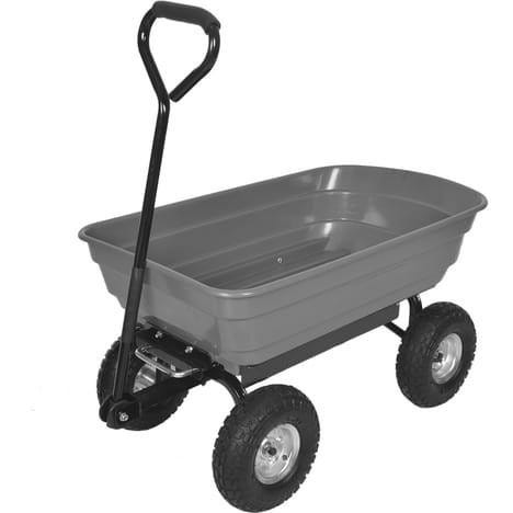 Remorque trainée basculante, équipée de quatre roues 410/350-4 (chambre à air valve coudée). Bac gris (945 x 505 x 210 mm soit 75 litres). Capacité maximale 250 kg.Coloris : gris.